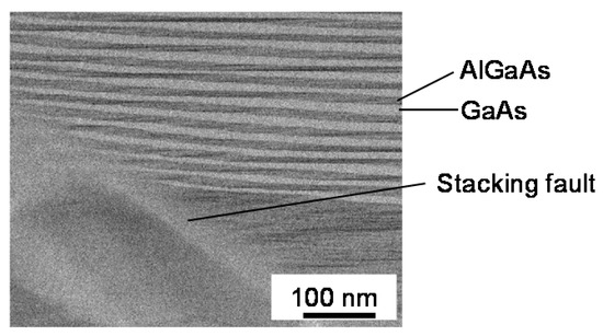 To visually verify the structure fluctuations at higher Tg, cross-sectional TEM analysis was carried out for the sample grown at 600 °C. The scan area depicted in Figure 6 is beneath the apex of the triangular pattern observed in Figure 3h. Stacking faults, which can be caused by the deviations from stoichiometry [32], were formed diagonally, and the thicknesses of GaAs well and AlGaAs barrier layers fluctuated by several nm or more. Such film thickness fluctuations caused a decline in satellite peaks in XRD data in Figure 4, and an increase in the PL linewidth in Figure 5c. Since the stacking faults and point defects that exist around them can act as non-radiative recombination centers, it is reasonable that the PL intensity decreased in a 600 °C sample with many triangular patterns having stacking faults.