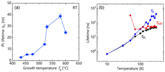 In this section, we investigate the carrier and spin dynamics measured by the TRPL method. Figure 7a shows the Tg dependence of τPL measured at RT. Similar to Tg dependence of CW-PL intensity (shown in Figure 5b), τPL increased with Tg monotonously up to Tg = 580 °C, and then decreased with further increases in Tg. The maximum τPL, 40 ns, at Tg = 580 °C is the longest value that has been reported in (110) GaAs/AlGaAs MQWs so far, and comparable to that for high-quality (100) MQWs [24,25]. To investigate carrier dynamics in detail, we extracted the radiative recombination time (τR) and the non-radiative recombination time (τNR) from the temperature dependence of τPL and PL intensity (IPL). τPL and IPL are given by the following equations using τR and τNR, respectively [31].