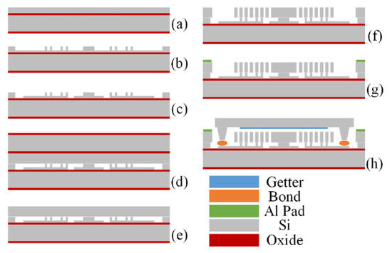 The fabrication process flow of the gyroscope. (a) a 6-inch SOI wafer with a 100 μm thick top device layer was used; (b) a cavity and anchors were etched; (c) the bottom electrodes layer was etched; (d) the device wafer was bonded; (e) the substrate of the handle wafer was removed; (f) the device structure was etch by DRIE; (g) the Al pads were fabricated; (h) the device was sealed by WLP process.