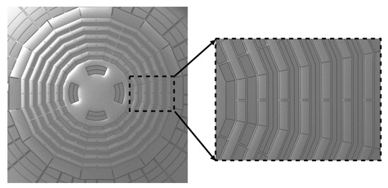 A sixteen-sided cobweb-like disk resonator MEMS gyroscope was designed and fabricated [26,27,28]. The gyroscope consisted of 10 concentric sixteen-sided cobweb-like rings connected through eight alternating spokes to a single central anchor, as shown in Figure 2. The diameter of the central anchor was 1.7 mm, and the thickness of each ring was 13 μm. The gyroscope drive modal excitation electrodes were distributed along the 0° and 180° angular distribution of structure, the drive modal detection electrodes were distributed along the 90° and 270°, the sense modal excitation electrodes were distributed along the 45° and 225°, and the sense modal detection electrodes were distributed along the 135° and 315°. All the excitation electrodes and the detection electrodes were nested in the middle of the multilayer sixteen-sided cobweb-like rings. The electrostatic tuning electrodes were evenly distributed on the outside and inside of the structure at 22.5° equal intervals.