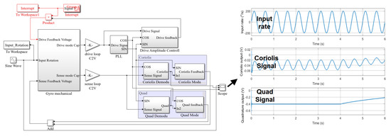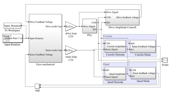 The gyroscope Simulink simulation model was established as shown in Figure 6. The gyroscope drive loop used PLL (phase lock loop) for frequency control and used AGC (auto gain control) for amplitude control. The sense loop used the in-phase signal and the quadrature signal to demodulate the quadrature error signal and the Coriolis signal, respectively. Then each signal was PID adjusted separately. After quadrature modulation and in-phase modulation, they were summed and fed back to the sense excitation terminal. Thus, the drive closed-loop excitation and sensitive closed-loop detection were achieved.