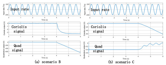 Similarly, in scenarios B and C, the value of point B and C were modified to zero, after the fourth second. The simulation results are shown in Figure 8. The Simulink model verified that, by monitoring whether the amplitude of the quadrature error signal deviated from the initial value, it was possible to determine whether the scale factor and bias of the gyroscope also deviated. When the amplitude of the quadrature error signal had a serious deviation, it could be concluded that the gyroscope failed.