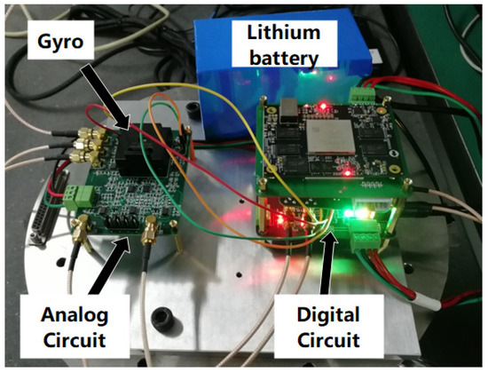 The circuit was mainly composed of C/V conversion, front-end analog amplification, A/D conversion, FPGA, D/A conversion, and a carrier generator. Figure 9 is the photo of the gyroscope circuit. The sense modal displacement signal was input into the FPGA after C/V conversion and A/D sampling. Then, the quadrature demodulation and the in-phase demodulation were performed, respectively, in the FPGA. The amplitude of the quadrature signal demodulation was output synchronously with the Coriolis signal.