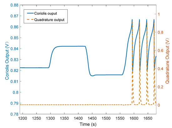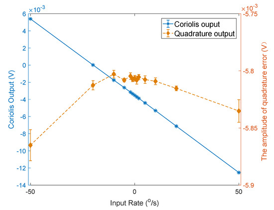 Figure 11 shows the variation curves of the Coriolis signal and the amplitude of the quadrature error signal of one of the test gyroscopes as the input angular velocity was changed. It can be seen that the amplitude of the quadrature error signal hardly changed with alterations in the input angular velocity.