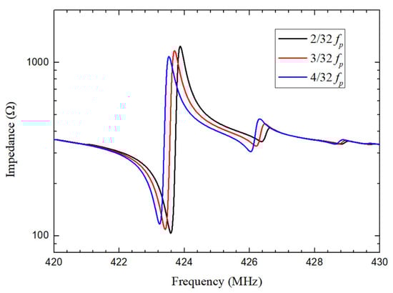 Figure 2. Simulated impedance curves of QSAW resonator with λ of 10.4 μ m for different spaces of 2 λ /32, 3 λ /32 and 4 λ /32.