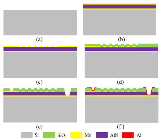 Figure 3. Process flow of the QSAW resonators. (a) Starting with a Si wafer, (b) Mo/AlN/Mo layers deposition, (c) Top Mo layer patterning to define IDT fingers and reflector gratings, (d) Top oxide deposition, (e) Contact vias opening to access the top and bottom electrodes, (f) Al deposition and patterning to form the bonding pads and connection lines.
