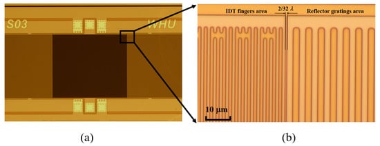 The optical microscope images of a fabricated QSAW resonator are shown in Figure 4. The IDT fingers are located at the center area, and the reflector gratings are located at two flanks. The IDT fingers and reflector gratings are clearly visible as displayed in Figure 4b. The space between IDT fingers and reflector gratings is defined as 2 λ /32.