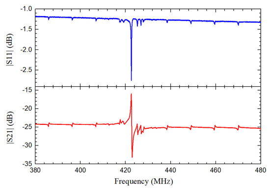 Scattering (S) parameters of the fabricated QSAW resonators are characterized by a Keysight vector network analyzer in air with an open chamber probe station at room temperature. The devices are measured with ground-signal-ground (GSG) probes after conducting a standard short-open-load-through calibration using a standard calibration substrate. The measured S11 and S21 curves for fabricated resonator with λ of 10.4 μ m in a wide frequency range from 380 MHz to 480 MHz are shown in Figure 5. As displayed in Figure 5, the series resonance frequency f s and the parallel resonance frequency f p are 422.50 MHz and 422.99 MHz, respectively. The insertion loss is −16.54 dB and Q is 1616 at its series resonance frequency.
