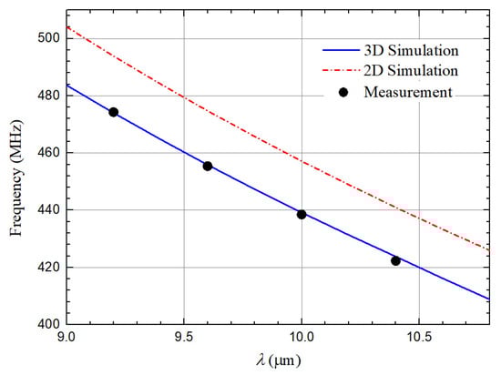 Figure 6. 2D, 3D FEA simulated and measured frequencies with different λ .
