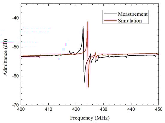 Figure 7. Measured and simulated admittance responses of the QSAW resonator with λ of 10.4 μ m in a frequency range from 400 MHz to 450 MHz.