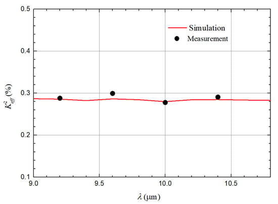 Figure 8. Measured and simulated k e f f 2 of the QSAW resonator with different λ .
