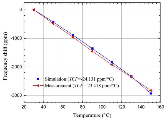 Figure 9. Measured and simulated TCFs of the QSAW resonator with λ of 10.4 μ m in a temperature range from 30 °C to 150 °C.