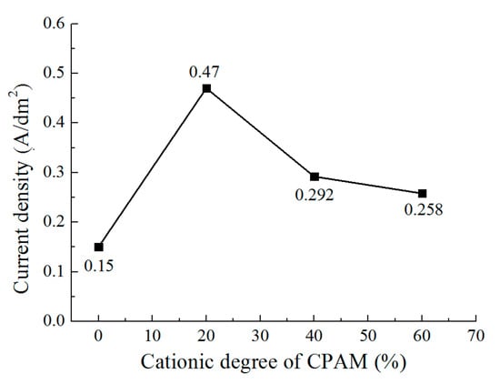 - Compared to the electrolyte without CPAM, the CPAM–ZnSO4 electrolyte enables the electrochemical deposition of zinc at the low voltage of 0.3 V. The cationic degree of CPAM has a significant influence on the deposition process, and compared to other cationic degrees of CPAM, the cationic degree of 20% enhances the electrolyte conductivity as well as the current density, which improves the deposition density.