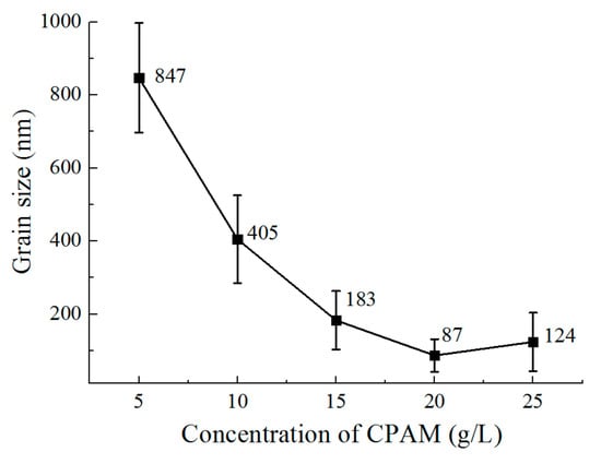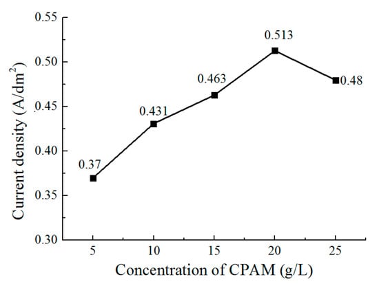 - The concentration of CPAM affects the electrolyte viscosity and conductivity. Compared to other concentrations, the concentration of 20 g/L was observed to improve the electrolyte conductivity and to maintain the viscosity at a low value at the same time. A bright deposited coating with a grain size of 87 nm could be obtained at this concentration, which is better than the grain size observed with other concentrations.