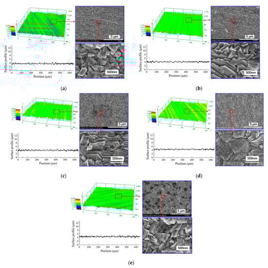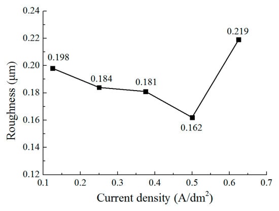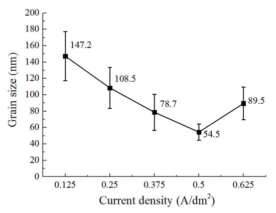 - The current density affects the grain structure of the deposited coating and the surface roughness. When the current density is increased, the grain structure changes from a blocky grain shape to a lamellar grain shape, and the grain size is also refined at the same time. With the current density of 0.5 A/dm2, a dense coating was deposited, the size of the lamellar grain was 54.5 nm, and the surface roughness was reduced to 0.162 μm.