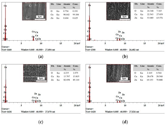 Figure 1 shows the surface morphology of the deposited coating with different cationic degrees, and Figure 2 shows the energy dispersive spectrometer (EDS) results of the deposited coating with different cationic degrees. The substrate surface before deposition is different from how it is after deposition (Figure 1a). Figure 1b shows the substrate deposited without CPAM in electrolyte; some regions of the substrate were exposed, and no zinc was deposited. The EDS results show that the Cu and Zn content was 22.543 and 53.089 at.%, respectively (Figure 2b), showing an obviously uneven deposition. When the electrolyte was added with CPAM, the whole surface of the substrate was deposited with zinc, and no specific region was exposed. Furthermore, the SEM image shows that the quality of the deposited coating changed with the different cationic degrees of CPAM. With a cationic degree of 20%, the deposited coating densified, and only a small number of pits exist on the deposited surface (Figure 1c), and the Zn content increased to 82.058 at.% (Figure 2c). With the cationic degree increased to 40%, the size of pit became enlarged, the distribution became wider at the same time (Figure 1d), and the Zn content reduced to 69.153 at.% (Figure 2d). When the cationic degree reached 60%, the pits became more obvious, the surface quality was further deteriorated (Figure 1e), and the Zn content further decreased to 66.233 at.% (Figure 2e). These results indicate that compared to traditional electrolyte, a CPAM–electrolyte significantly improves the quality of the deposited coating. Meanwhile, the cationic degree of CPAM has an important influence on the density of the deposited coating. Compared to other cationic degrees of CPAM, the cationic degree of 20% proved useful in obtaining a relatively dense coating.