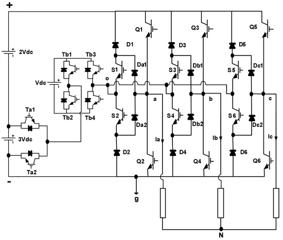 The circuit diagram of the proposed three-phase six-level MLI topology is depicted in Figure 1. Six unidirectional switches formed by (S1~S6) and (Da1~Dc2) diodes are connected with a classical three-phase six-switch (Q1~Q6) to build the main bridge. On the other hand, a single DC voltage supply, a half-bridge cell consisting of two switches (Ta1, Ta2) and a single DC supply along with a full-bridge power cell comprising four switches (Tb1~Tb4) and a DC supply are connected together to form a multilevel DC-link voltage. The DC voltages for half-bridge and full-bridge power cells are 3Vdc and Vdc, respectively, while the DC voltage for a single supply is 2Vdc. The power cell switches are turned on/off to synthesize four consecutive voltage levels: 4Vdc, 3Vdc, 2Vdc and Vdc at the middle point (o) relating to the inverter’s ground. Table 1 illustrates the switching operation of the proposed inverter.