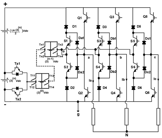 The goal of the multilevel DC-link is to provide the H-bridge with successive positive voltage levels starting from zero voltage, whereas the purpose of the half-bridge is to provide the desired outputs comprising of negative and positive voltage. The aforementioned method has been utilized to propose different three-phase cascaded MLI topologies which are presented in [18,19,20]. To further decrease the overall amount of DC supplies and switches in these topologies, a new multilevel inverter configuration has been recently suggested in [21,22,23,24]. These MLIs were built by utilizing the combination of a twelve-switch three-phase Bridge and a multilevel DC-link. The multilevel DC-link is constructed by a fixed supply of cascaded H-bridge power modules and DC voltage. Comparing with the available MLI topologies, the projected configuration comes with more voltage levels and lesser power components.