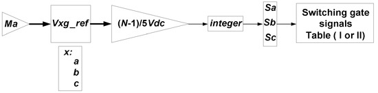 where Sa, Sb and Sc are switching positions. Vag, Vbg and Vcg are the MLI’s line to ground voltages and N = 6 is the number of voltage levels. Since the topology employed for the proposed MLI is modeled to obtain the three-phase well-adjusted line to line output voltages producing the highest number of voltage levels, a suitable switching structure is needed for generating the MLI’s gate pulses. Consecutively, these switching states generate the gate pulses and drive the studied MLI under all modulation indexes. Different modulation techniques have been suggested to control the multilevel inverters. These modulation methods are categorized depending on the operating switching frequency [25]. The low frequency modulation method known as selective harmonic elimination (SHE-PWM) is usually employed to predefine and pre-calculate the optimal switching angles. To obtain a solution for the angles, a set of equations is normally solved offline using numerical methods [26,27]. The proposed MLI can be easily controlled, and the desired outputs can be simply achieved with regard to the MLI’s switching states Sa, Sb and Sc. Therefore, a new modulation method was recently suggested in [28] where each phase in the proposed inverter is controlled independently. For a given modulation index Ma, the inverter’s switching states Sa, Sb and Sc are determined with respect to the MLI’s line to ground reference voltages Vag_ref, Vbg_ref and Vcg_ref. The correlation among the MLI’s reference line to ground voltages and the respective switching sequences is: