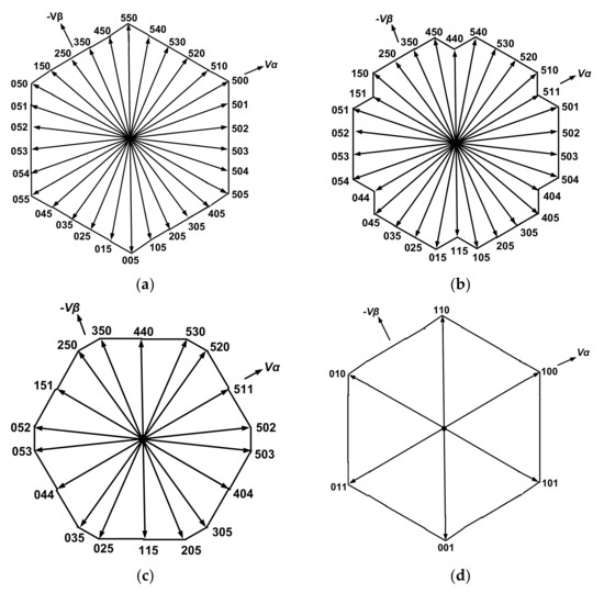 Four different space vector diagrams representing the function of the three-phase MLI with four valid switching sequences are shown in Figure 4.