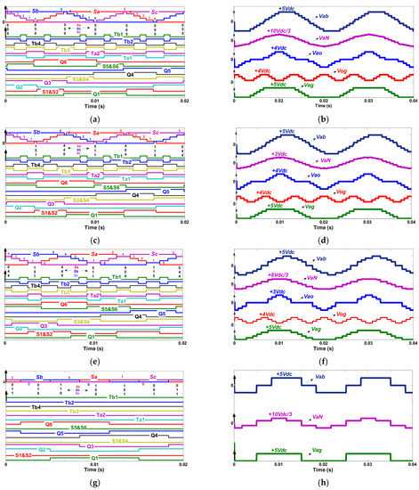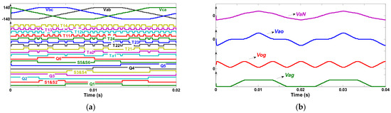 The extended configuration is also verified by simulating a model for (n = 2). The simulation is done utilizing 10 V voltage supply and a three-phase resistive-inductive load of 237 Ω–0.53 H as output. The nearest vector modulation technique is implemented with a nominal frequency of 50 Hz. The simulation results of fifteen-level line to line output voltage (Vab) built on the extended model and its equivalent switching pulses are illustrated in Figure 6a. In addition, the output voltages of VaN, Vao, Vog and Vag are also shown in Figure 6b.