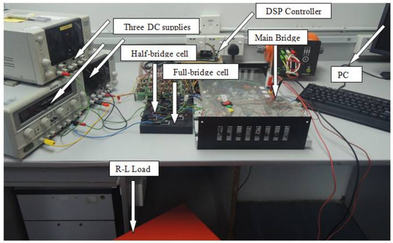 An inverter prototype is built and tested by applying f = 50 Hz and Ma = (1.3, 1.15, 0.98 and 0.8) for validating the compatibility of the studied modulation method and the performance of the proposed inverter, as shown in Figure 8. Three isolated DC voltage supplies having different magnitudes (Vdc = 20 V, 3Vdc = 60 V and 2Vdc = 40 V) are used to form the multilevel DC-link. A three-phase load (237 Ω–0.5 H) is used as the output. The inverter control algorithm based on the suggested modulation technique is developed using Simulink/ MATLAB software and TMS320F28335 DSP controller. Figure 9 illustrates the proposed MLI’s control diagram.