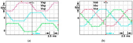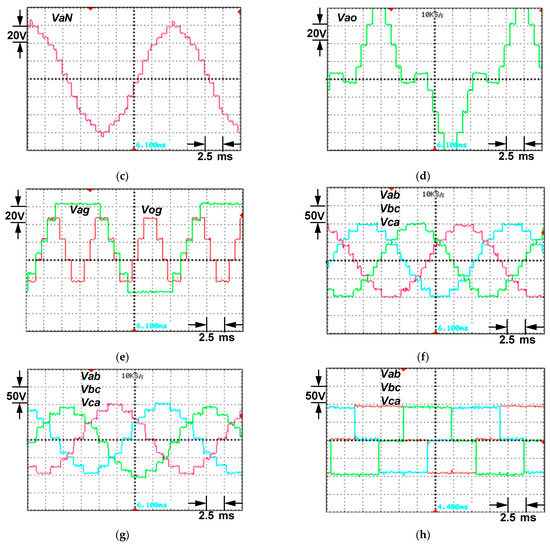 The inverter line to ground, line to line, line to neutral, line to center and center to ground outputs are shown in Figure 10. For Ma = 1.3, the waveforms for Vag, Vbg and Vcg have six symmetric voltage levels with the highest value of 100 V, as shown in Figure 10a. It should be addressed that the experimental results are presented following the RGB color format, which means all the waveforms of phase a are represented by red color, while the waveforms of phase b and phase c are represented by a green and blue color, respectively.