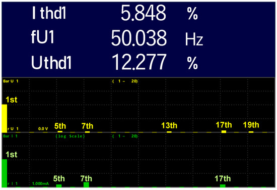 Harmonic spectrum of load current (yellow) and line to line voltage (green).