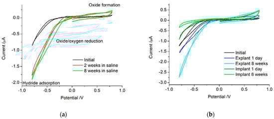 Voltammetric cycle of a platinum cochlear implant electrode from 0 → −0.8 → 0.8 → 0 V at a scan rate of 20 mV s−1: (a) electrode tested and stored in saline over 8 weeks and (b) electrode initially tested in saline, implanted in a cochlea for 1 day, explanted after 1 day, reimplanted in cochlea for 8 weeks, and explanted after 8 weeks.