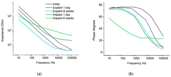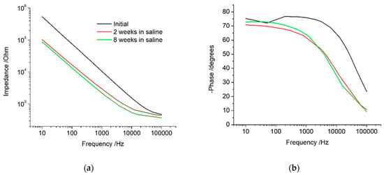 (a) Impedance; (b) Phase Angle. Electrochemical impedance spectroscopy of a platinum cochlear implant electrode at 0 V with an AC amplitude of 10 mV before cyclic voltammetry. Electrode tested and stored in saline over 8 weeks.