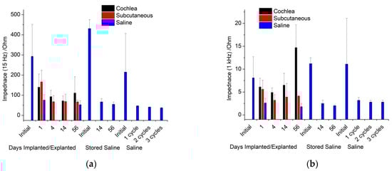 Impedance at (a) 15 Hz and (b) 1 kHz over time; initial, explanted, or stored electrode response in saline, or in vivo response in the cochlea or subcutaneously.