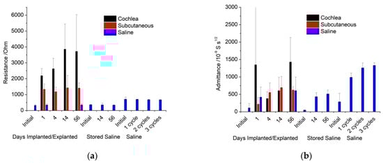 Equivalent circuit parameters (a) resistance and (b) admittance over time; initial, explanted, or stored electrode response in saline, or in vivo response in the cochlea or subcutaneously.
