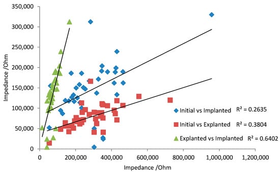 Correlation of impedance at 15 Hz. Initial saline measurement vs. implanted for 1 day, initial saline measurement vs. explanted after 1 day, and explanted vs. implanted for 1 day.
