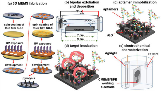 Previous studies have thoroughly discussed the deployed aptasensor development [14,15]. The process includes activating the amino-tags of aptamers in a solution of 20 mg mL−1 EDC and 10 µL of 20 mg mL−1 NHS and immobilizing the aptamers via the drop-casting method. After 2 h of incubation, electrodes were washed thoroughly in DI water to wash away freestanding aptamers. The remaining blank areas were covered with the aqueous solution of 0.1 M PBS + 1% (v:v) Tween-20 to reduce the non-selective physical adsorption of interference agents. The aptamer immobilized electrodes (designated as C-MEMS/rGO/Apt) (Figure 1c) were washed with DI water for 5 min and stored in 0.1 M TE buffer in the refrigerator (4 °C) when not in use.