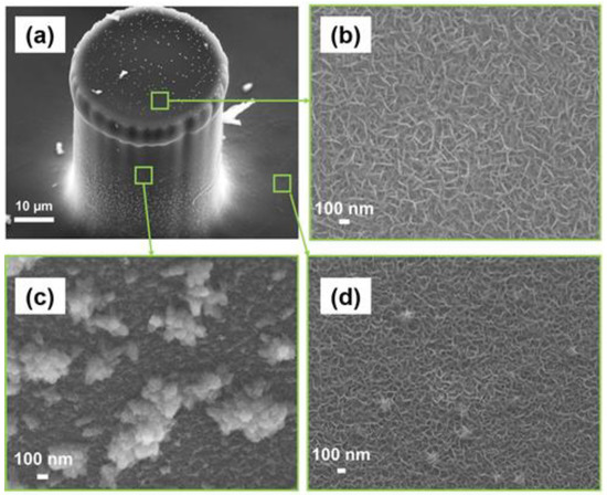 SEM images of (a) C-MEMS micro pillars with BPE-rGO, (b) BPE-rGO deposition on top of the micropillar, (c) BPE-rGO deposited on sides of the micropillar, and (d) BPE-rGO deposited on thin film base electrode.