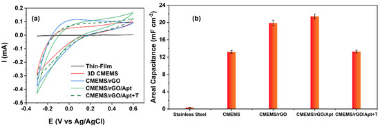 Several studies have shown that the deposition of rGO via the BPE technique on the perspective electrode considerably increases the electrode’s double layer (i.e., areal) capacitance [15,37,38]. For instance, Forouzanfar et al. have shown that the deposition of BPE-rGO on 0.5 cm2 stainless steel electrodes increases the areal capacitance from 0.80 mF cm−2 for the bare stainless steel electrodes to 2.69 mF cm−2 for the stainless steel electrodes with a thin layer of rGO [15]. Such increase in capacitance is a highly preferred aspect for label-free electrochemical biosensors since it can reduce the background noise and enhance the prospective biosensor’s sensitivity and limit of detection. Furthermore, the previous studies on C-MEMS technology have shown that the C-MEMS microelectrodes have large double-layer capacitances without any modifications, which can be promptly harvested for label-free electrochemical aptasensors [3,14]. Therefore, a compatible in-situ integration of C-MEMS and BPE deposition was expected to produce electrodes with sufficiently high capacitances for label-free detection of PDGF-BB biomarkers. In order to explore this hypothesis, CV tests were done on a stainless steel control sample and 3D C-MEMS microelectrodes with the same active area of 0.5 cm2 at each development stage. The CV analysis is given in Figure 5a. The area under the CV curve can be used to calculate the areal capacitance using Equation (1) [39]: