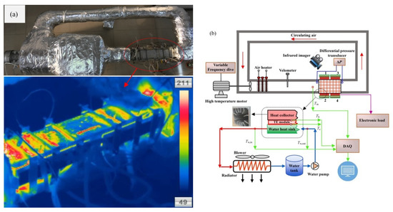 The schematic of the experimental setup is shown in Figure 1. The TEG system consisted of a square aluminum-finned heat collector, twenty TE modules, four water-cooled heat sinks, a water tank, a water pump and a heat radiator with blowers. The heat collector was mounted directly to the exit of the electric heater as part of the circulation channel. Dimensions of the heat collector were 450 mm [length] × 77 mm [inner width] × 77 mm [inner height], and 12 flat-plate fins with a thickness of 2.5 mm were designed. The distribution of the abovementioned fins adhered to the following procedures: (1) a cylinder-shaped hollow zone with a diameter of 38 mm was deliberately left, which acted as the bypass channel; (2) eight fins (four on each side) on two opposite sides of the inner wall of the heat collector were integrated, four fins were measured with a height of 16 mm, and the height of the other four fins was 23 mm; (3) four fins (two on each side) with a height of 19 mm on the other two opposite sides of the inner wall of the heat collector were arranged. A speed control motor was installed upstream of the electric heater, providing the forcing power of the air flow, and a variable frequency drive was used to adjust the motor speed. The heating power varied between 1 kW and 3 kW. The air velocity varied between 2.06 m/s and 8.11 m/s, which was measured with a Testo hot-wire velocimeter 405i with an accuracy of 5%. An infrared imager Dali T8 was used to capture the temperature distribution of the TEG system. A differential pressure transducer CHY-130 was installed to measure the pressure drop of the heat collector. The resolution of the thermal imager was 25 μm, and the accuracy of the differential pressure transducer was 0.5%.