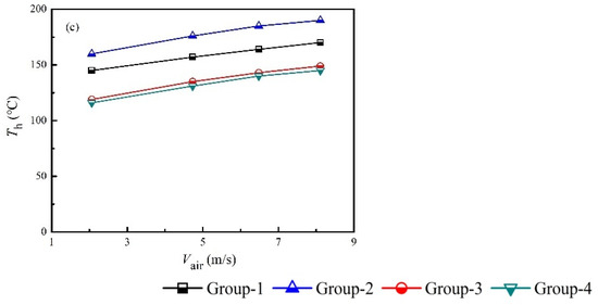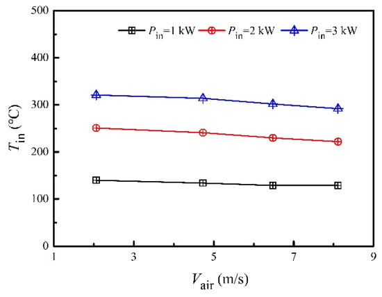 Hot-end temperatures of different groups under various heating powers and air velocities. (a) Pin = 1 kW. (b) Pin = 2 kW. (c) Pin = 3 kW.