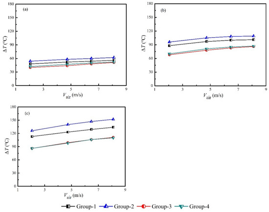 Temperature differences of different groups under various heating powers and air velocities. (a) Pin = 1 kW. (b) Pin = 2 kW. (c) Pin = 3 kW.