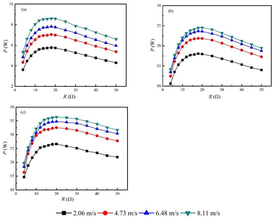 The electric powers generated by the TEG system at different load resistances under various heating powers and air velocities were shown in Figure 5. Air velocity was important in the augmentation of electric power output under a fixed heating power. For example, the maximum electric power at 8.11 m/s was 36.4 W at Pin = 3 kW. However, the maximum electric power was only 26.6 W at 2.06 m/s, under the same heating power, which means that a 26.9% of downgrade was reached. On the other hand, power load tests showed that the optimized load resistance was located at 20 Ω, indicating that the internal resistance of each TE module was 4 Ω. This was slightly larger than the data (3.6 Ω) provided by the manufacture, which was caused by the increased temperature compared with the room temperature. The maximum electric powers were 8.6 W, 24.5 W and 36.4 W when the heating power was set at 1 kW, 2 kW and 3 kW, respectively. This implies that the inlet air temperature was another important parameter for the power generation of the TEG system. In order to increase the electric power output, both the temperature and the velocity of the flue gases should be as large as possible. However, these two parameters cannot be optimized in waste heat recovery applications because they are boundary conditions. The power generation densities were 268.7 W/m2, 765.6 W/m2 and 1137.5 W/m2 based on the area of the TE modules when the heating power was set at 1 kW, 2 kW and 3 kW, respectively. It seems that these power generation densities were obviously larger than that (~150 W/m2) of commercial solar plates. However, using the internal area of the heat collector (0.151 m2) to calculate the power generation density led to new values of 57 W/m2, 162 W/m2, and 241 W/m2, respectively. As a consequence, these power generation densities turned to be comparable to that of solar plates. Nevertheless, TEG could be the most promising technology to convert waste heat into electricity in distributed small-scale engines, such as engines in passenger vehicles and inland vessels. The major reasons include its compactness and solid-state energy-conversion process, which are essentially required, as space is limited in the abovementioned energy systems.