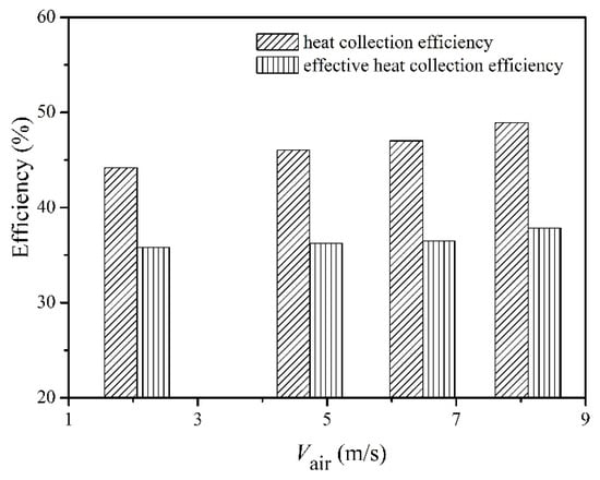 As shown in Figure 6, the average heat collection efficiency according to Equation (1) was 46.5%, and the average effective heat collection efficiency decreased to 36.6%, according to Equation (3). This was consistent with previous works, i.e., 32.9% in Kim’s work [8]. Increasing fin density could help to improve the heat collection efficiency, but it is subject to the pressure loss problem. Increasing the length of the heat collector could be another way to augment the heat collection efficiency. However, as shown in Figure 4, the temperature differences for Group-3 and Group-4 were obviously lower than those of Group-1 and Group-2. Therefore, the temperature difference will become even smaller as the length of the heat collector increases. As a consequence, minor improvements can be obtained when increasing the length of the heat collector.