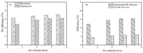 Conversion efficiencies when the heating power was 3 kW; (a) comparison between theoretical TE efficiencies and experimental results; (b) comparison of TE efficiencies and overall efficiencies.