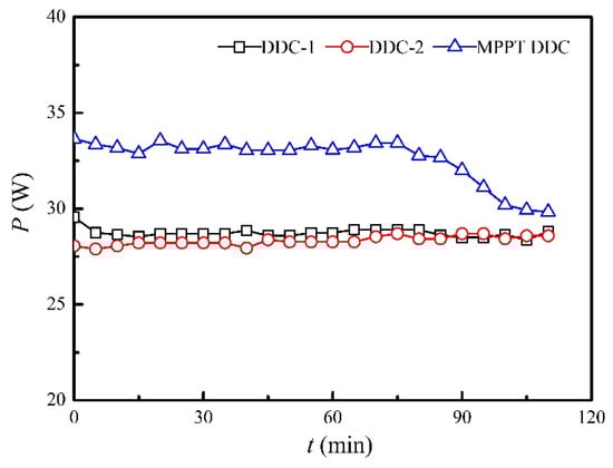 In real applications, a battery has to be employed to balance the power generation and electric output. Therefore, a DDC has to be used. Though MPPT DDCs are suggested in many references [23], a direct comparison between MPPT DDC and regular DDC is still lacking, specially presenting their charging curves into batteries. Figure 8 shows the experimental measured performances of two regular DDCs and a MPPT DDC. The internal resistance of the battery varies with time; therefore, the maximum electric power (36.4 W) cannot be reached. As shown in Figure 8, the MPPT DDC performs better than regular DDCs. The average charging power into the battery in the first 60 minutes was 33.2 W for the MPPT DDC, whereas the average charging powers were 28.8 W and 28.2 W for DDC-1 and DDC-2, respectively. This implied that an improvement of 15.3% was achieved, which was consistent with a previous work, i.e., 14.5% of improvement reported in Yu and Chau’s work [24]. After 80 min of charging, the battery accepted less electric power, and the charging power dropped to a lower value for MPPT DDC, whereas the charging powers for regular DDCs maintained unchanged, because the total amount of charged electric power was less than that with MPPT DDC. In other words, the shorter time needed to reach a saturated charging mode denoted a higher conversion efficiency of the DDC. The conversion efficiency for MPPT DDC was 91.2%, whereas the average conversion efficiencies were 79.2% and 77.5% for DDC-1 and DDC-2, respectively, which was consistent with our previous works [25]. Therefore, MPPT DDC is recommended in future studies.