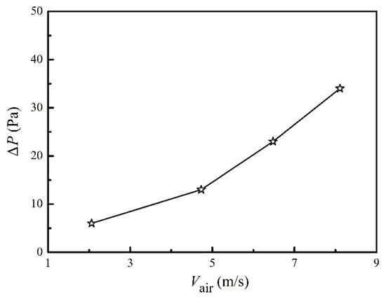 Pressure drops at different air velocities when the heating power was 3 kW.