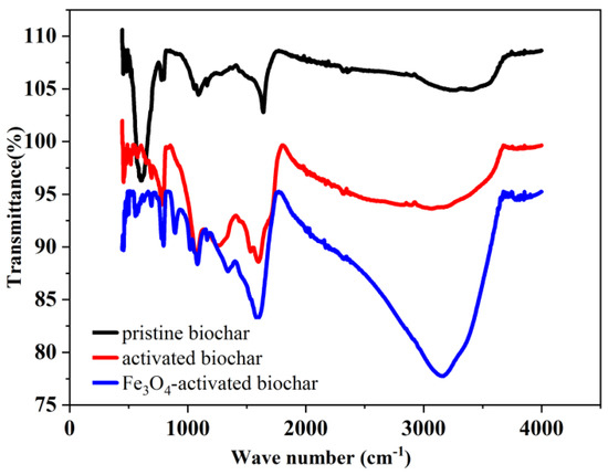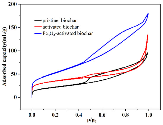 The thus–prepared samples were further characterized using the N2 adsorption–desorption curve. As depicted in Figure 3, the isotherm curves were consistent with the IUPAC classification type Ⅱ curve and H3 type hysteresis loop. The specific surface areas of the pristine biochar, activated biochar and Fe3O4–activated biochar were calculated as 75.34, 126.27 and 247.45 m2/g, respectively. Compared with the pristine biochar, the specific surface area of the activated biochar increased sharply, because a porous structure with a large number of functional groups (such as carboxyl groups) could readily adsorb a large amount of Fe2+/Fe3+. Consequently, a large amount of Fe3O4 particles was synthesized and coated on the surface of the biochar to further increase the specific surface area.