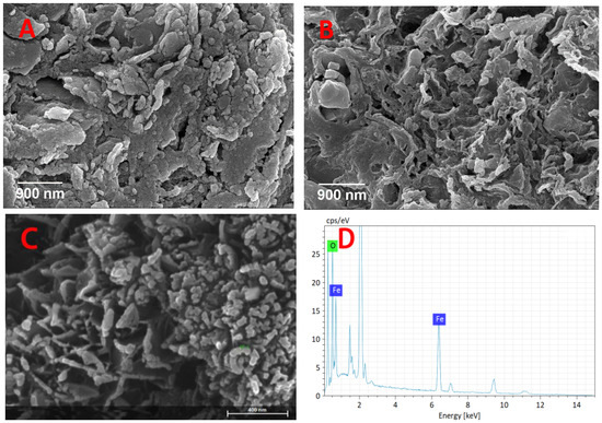 SEM images of the (A) pristine biochar, (B) activated biochar and (C) Fe3O4–activated biochar. (D) EDX elemental analysis of the Fe3O4–activated biochar.