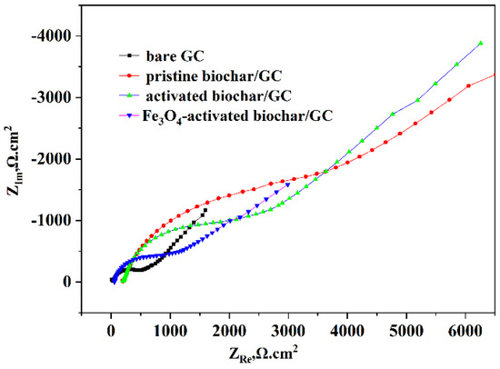 Electrochemical impedance spectroscopy (EIS) is an effective tool with which to characterize the interface properties of electrochemical sensors. Figure 4 shows the impedance spectra, represented as Nyquist plots (ZIm vs. ZRe), for (a) bare GC (b) pristine biochar/GC (c) activated biochar/GC and (d) Fe3O4–activated biochar/GC in 5 mM Fe(CN)63−/4− containing a 0.1 M KCl solution (pH = 7.0). All of them show the impedance plots comprising depressed semicircles and straight–line features. Generally, the diameter of the semicircle is directly proportional to the electro transfer resistance (Rct) in the Nyquist plots of EIS [32]. The bare GC (curve (a)) had a relatively small electron transfer resistance (Rct), and after being modified with the pristine biochar, the significant increase in the Rct indicated that the pristine biochar has a stronger obstruction effect than the bare GC. After the activated biochar had been immobilized on the electrode surface, the Rct had a large electron transfer resistance with a big semicircle domain, and this can be attributed to the presence of more functional groups (carboxyl, nitro) on its surface, which carried a negative charge. Thus, the electron transfer was retarded between the redox probe and the double electrochemical layer. However, the Rct dramatically decreasedwhen modified the Fe3O4–activated biochar, which implied that Fe3O4 modification could effectively accelerate the electron transfer as we expected. The results demonstrated that the electrochemical sensor was well fabricated.