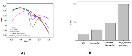 The voltametric behaviors of TBPPA were investigated under differential pulse voltammogram conditions using bare GC, pristine biochar/GC, activated biochar/GC and Fe3O4–activated biochar/GC. As shown in Figure 5, all the electrodes studied had an anodic peak at 0.65 V identified as TBPPA oxidation, but relatively poorly defined oxidation peaks were observed for the bare GC and biochar/GC. Compared with the other three electrodes, the peak current increased clearly for the Fe3O4–activated biochar/GC. The oxidation and this improvement of the voltametric response could be attributed to its larger specific surface area and more surface functional groups due to the contribution of further modification. Possible interaction mechanisms between the organic molecule and the surface of Fe3O4–activated biochar can mainly be summarized in three ways [13,15,16,33]: (1) the larger specific surface area leads to stronger physical adsorption, (2) π–π type interaction could occur between the aromatic ring of the organic molecule and biochar aromatic structures, and (3) the hydroxyl groups of TBPPA could interact with the carboxyl groups of the biochar to formation hydrogen bonds. Moreover, the mechanisms described above might work together in different combinations. Thus, the proposed electrochemical sensor, Fe3O4–activated biochar/GC, had a synergic effect on the signal intensity, which provided an anodic peak current that was nearly six–fold higher than those observed using bare GC, as shown in Figure 5B.