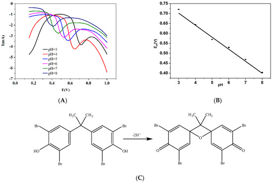 To develop an appropriate analytical condition for the sensitive detection of TBPPA, experimental parameters were optimized. Firstly, the pH influence on the electrochemical behavior of TBPPA was evaluated by using a BR buffer solution with a pH range of 3.0–8.0. As shown in Figure 6A, it was clear that the DPV signals reached a maximum at a pH of 4.0, and then decreased as the pH increased further. Thus, we chose a pH of 4.0 as the optimal pH value. Moreover, the potential of the oxidation peak shifted to less positive values as the pH increased, which illustrated that H+ was directly involved in the electrochemical oxidation process of TBBPA. Furthermore, the DPV signal of TBPPA showed a linear relationship between the pH and the anodic peak potential (Ep) with an equation of Ep (V) = 0.893–0.0060 pH (Figure 6B). Importantly, the slope value was approximately close to the theoretical value of 0.059 V per pH (298 K), indicating that there was an equal number in the proton and electron transfer in the electrochemical oxidation process of TBBPA. According to the results of previous studies, the possible electrochemical oxidation mechanism, if the number of electrons and protons involved in the TBBPA oxidation process stayed equal, could involve a 2H+/2e− transfer, as suggested in Figure 6C. In this mechanism, TBBPA is oxidized to quinone [10,11].