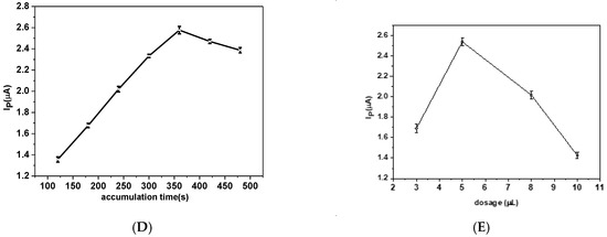 Lastly, the effect of the modified volume of the Fe3O4–activated biochar biochar on the DPV response was investigated in the range of 3 to 10 μL. The DPV responses for TBPPA increased with the rising of the dose from 3 to 5 μL, but decreased when the dosage exceeded 5 μL (Figure 6E), probably owing to the agglomeration of Fe3O4 nanoparticles and the poor conductivity of the thick film. Thus, 5 μL of 1 mg/mL Fe3O4–activated biochar suspension was used to modify the GC.